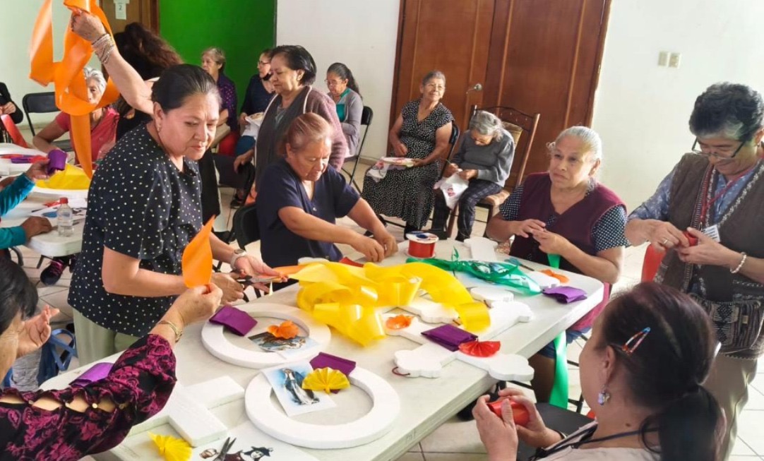 El Taller de Cocina permite a las y los asistentes preparar pan de muerto, integrando gastronomía y tradición en cada centro comunitario, mientras que los talleres de manualidades refuerzan la participación de las y los adultos mayores, quienes disfrutan adornando altares y creando piezas representativas de la festividad.